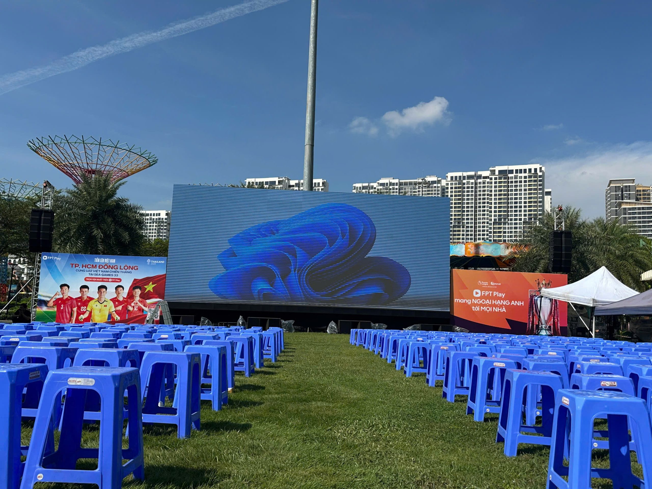 - Gói Fan Zone Ngoài Trời (Outdoor): Sử dụng màn hình LED P3.91 hoặc P4.81 chuyên dụng. Chống nước, độ sáng cực cao, chịu được thời tiết khắc nghiệt, phục vụ hàng trăm đến hàng ngàn khán giả tại quảng trường, sân vận động mini.